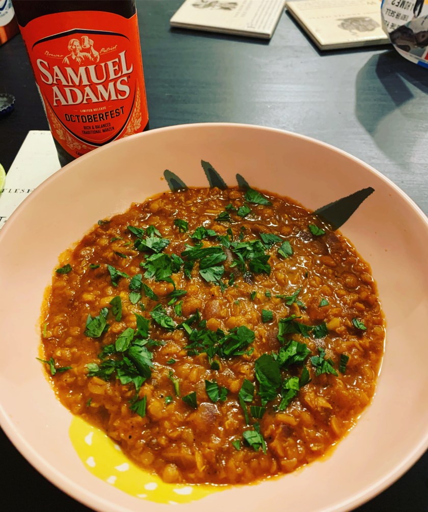 I remembered there was a red lentil stew recipe in the Feed the Resistance cookbook. Compiled by Julia Turshen, this book has a mash-up of recipes and articles on activism from various chefs and food activists. The proceeds to this book go to the ACLU, which is why I purchased this book roughly a year ago.