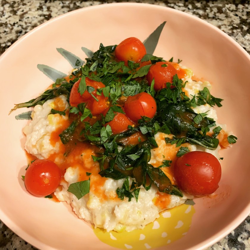 The grits recipe came from Bryant Terry’s Afro Vegan cookbook. This is a new cookbook for me and the first time making a recipe from this book. Since this is a vegan dish, there isn’t butter or cream in the grits. Instead, to make the grits creamy, Terry uses creamed cashews. Wow, were these grits creamy and fluffy!